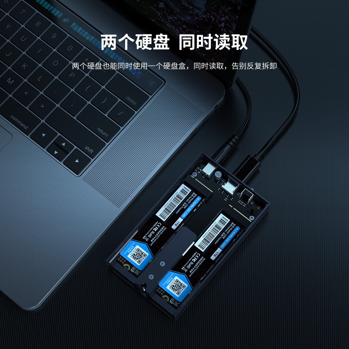 Type-c雙盤位M.2 NVMe硬盤盒,利用條紋散熱棱擴大散熱面積,雙盤位4TB