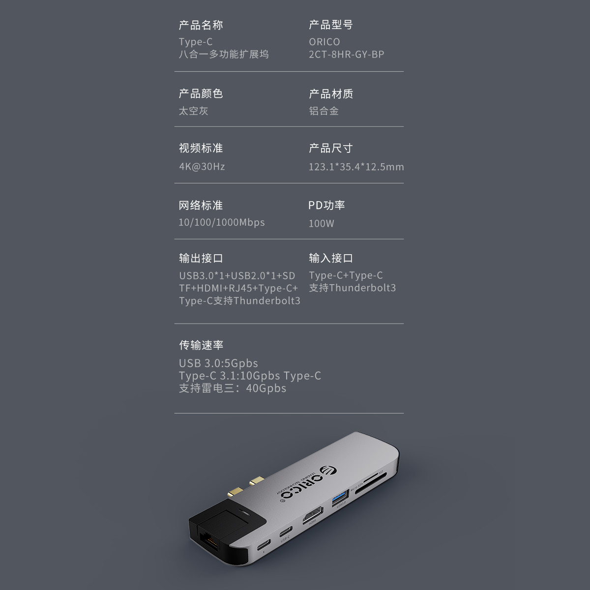USB3.0*1+USB2.0*1+SD/TF+HDMI+RJ45+Type-C+Type-C(支持Thunderbolt3)