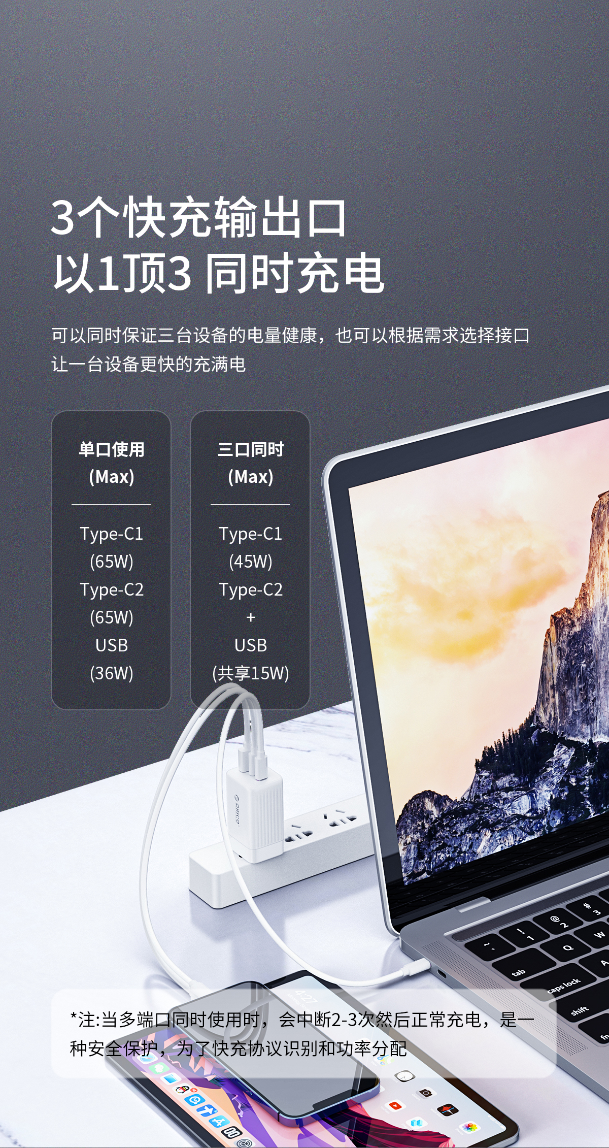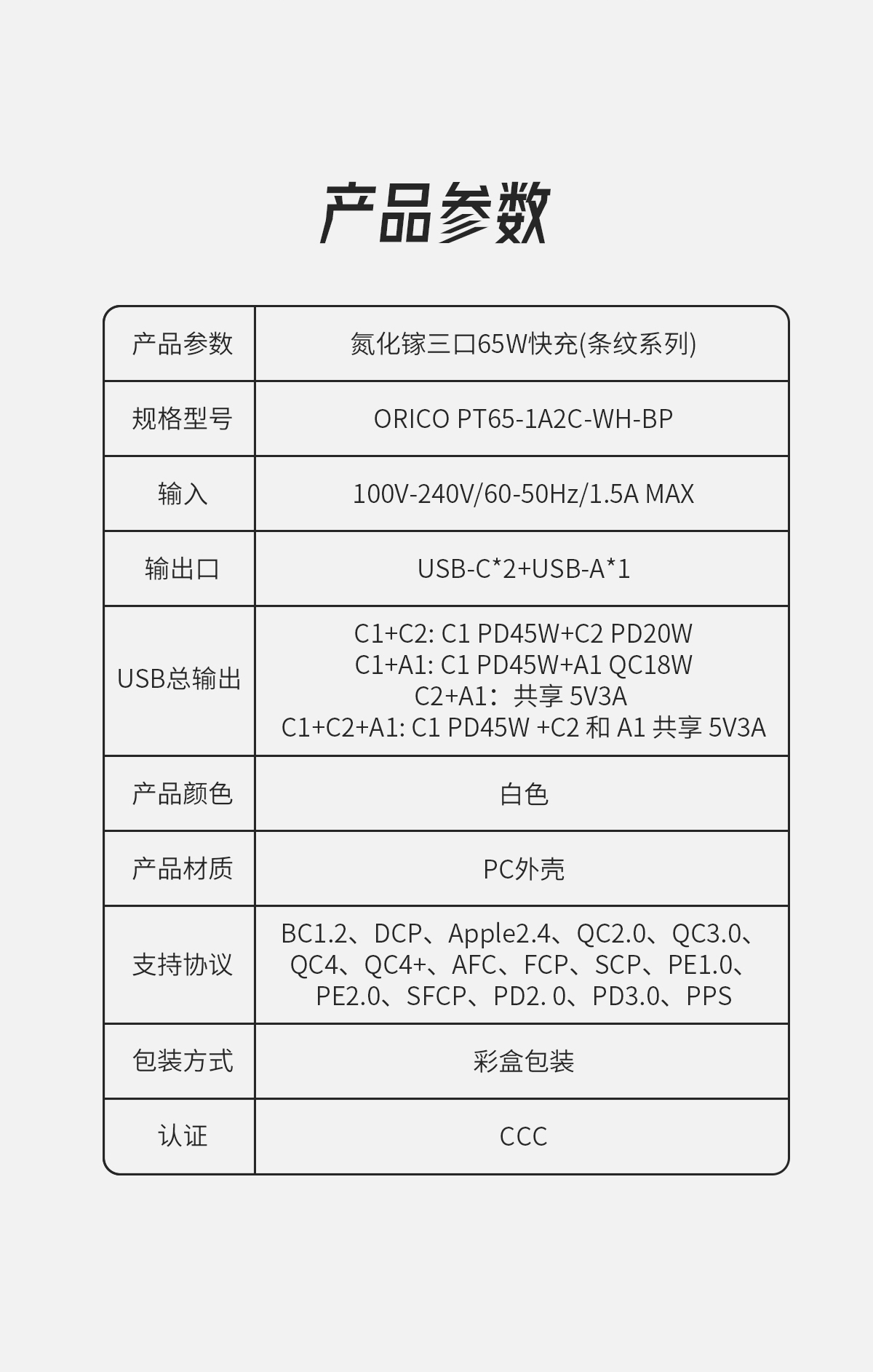 Type-C1 輸出 Onput:5V/3.0A、9V/3A、12V/3A、15V/3A、20V/3.25A; Type-C2 輸出 Onput:5V/3.0A、9V/3A、12V/3A、15V/3A、20V/3.25A; USB1 輸出 Output:4.5V/5A、5V/4.5A、9V/3.0A、12V/3.0A、20V/1.8A; Type-C1+Type-C2+USB1 輸出(Total): 65W