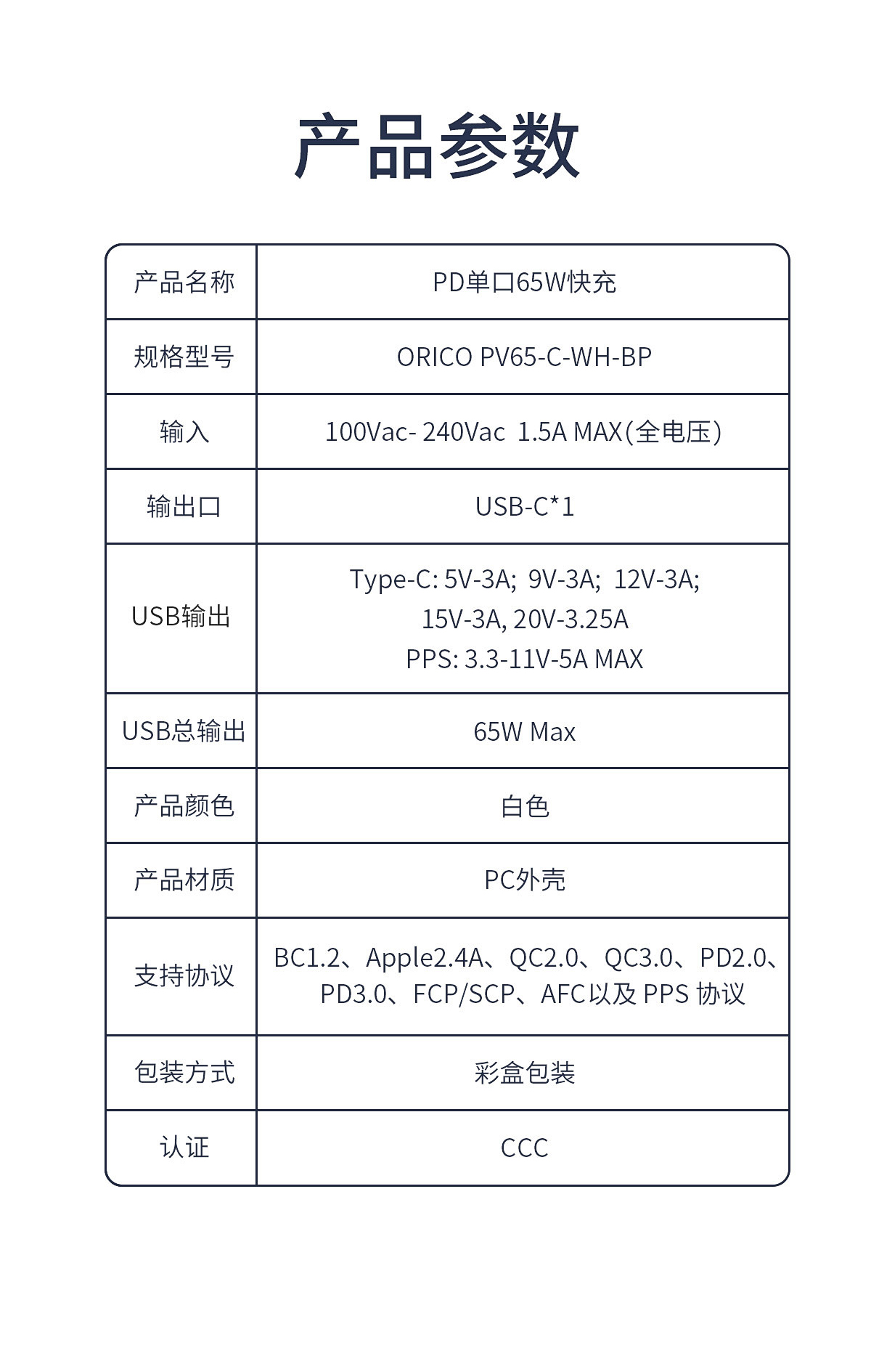 Type-C:5V-3A,9V-3A,12V-3A, 15V-3A,20V-3.25A; PPS:3.3-11V,5A MAX
