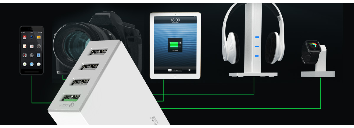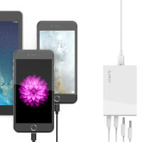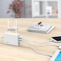 支持4臺設備同時充電,解決多人多設備充電問題,其中1個端口支持QC2.0(5V2.4A,9V2A,12V1.5A)輸出,3個端口支持5V2.4A大電流輸出,一臺設備幫您打造您的桌面充電站。