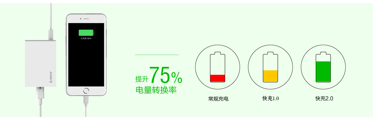 應急時刻,僅僅充電十分鐘,即可為您提供20%的續航,相比傳統充電器,充電速度提高了75%,30分鐘即可充至60%-75%的電量(以3000mAh的手機為例),QC2.0快速充電器大幅度減少您的充電等待時間。