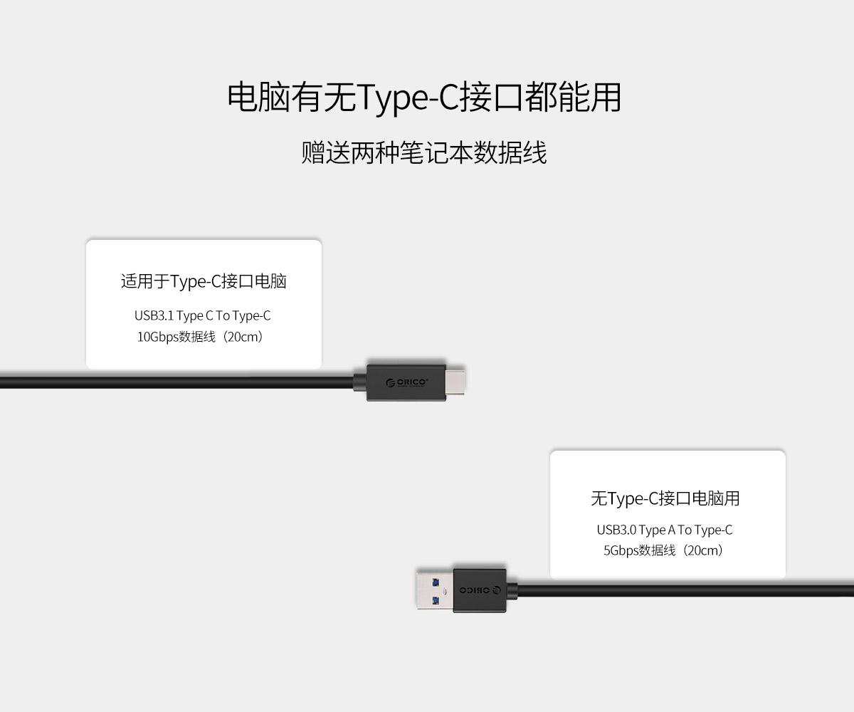 搭配兩條20CM長(zhǎng)度Type-C 傳輸數(shù)據(jù)線,一條USB3.0 Type A To Type-C (5Gbps) 和 USB3.1 Type C To Type-C 10Gbps數(shù)據(jù)線