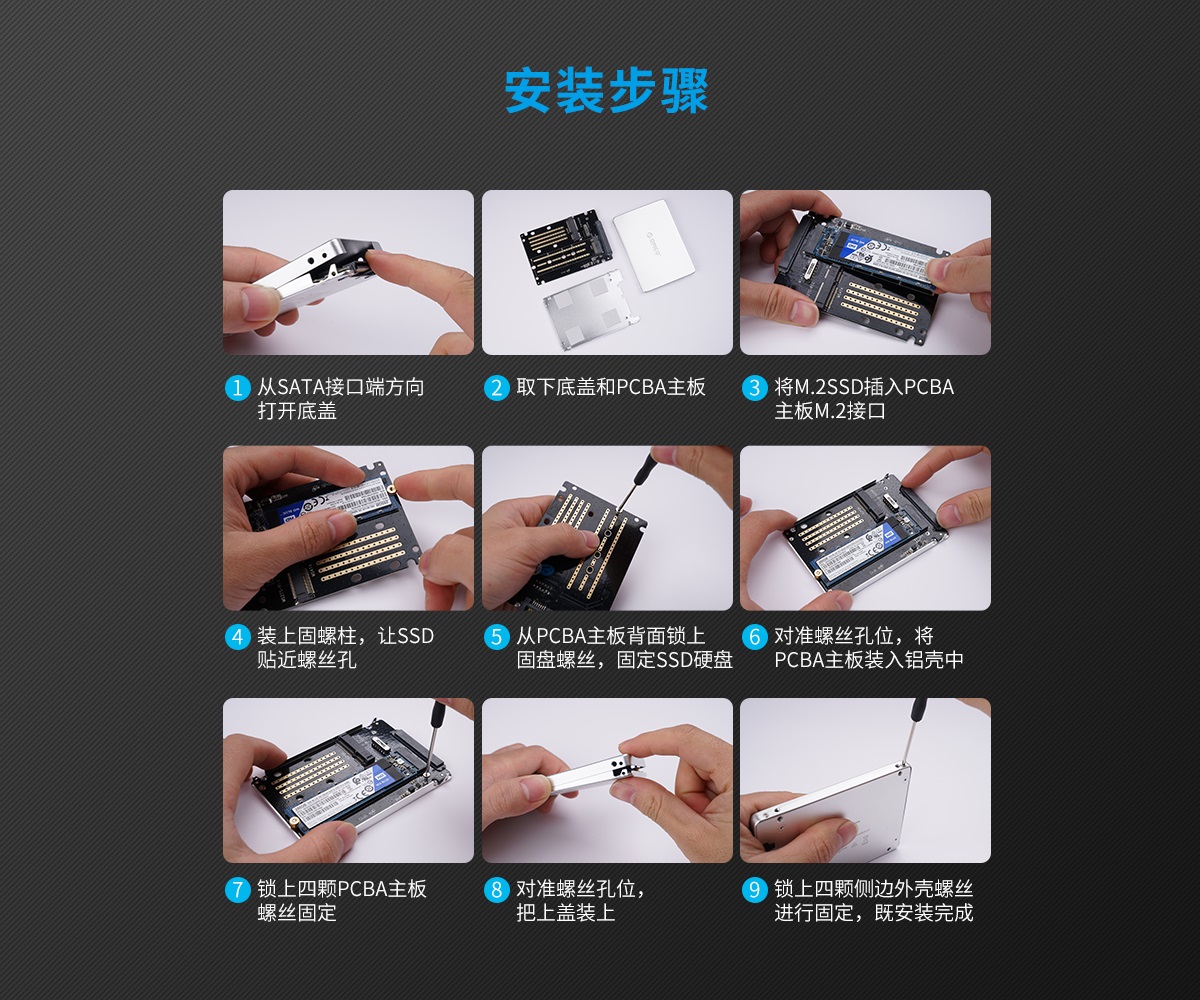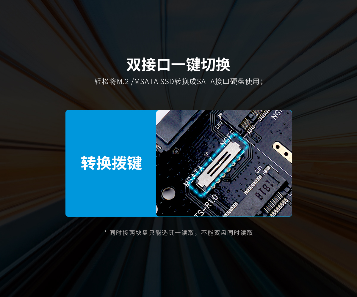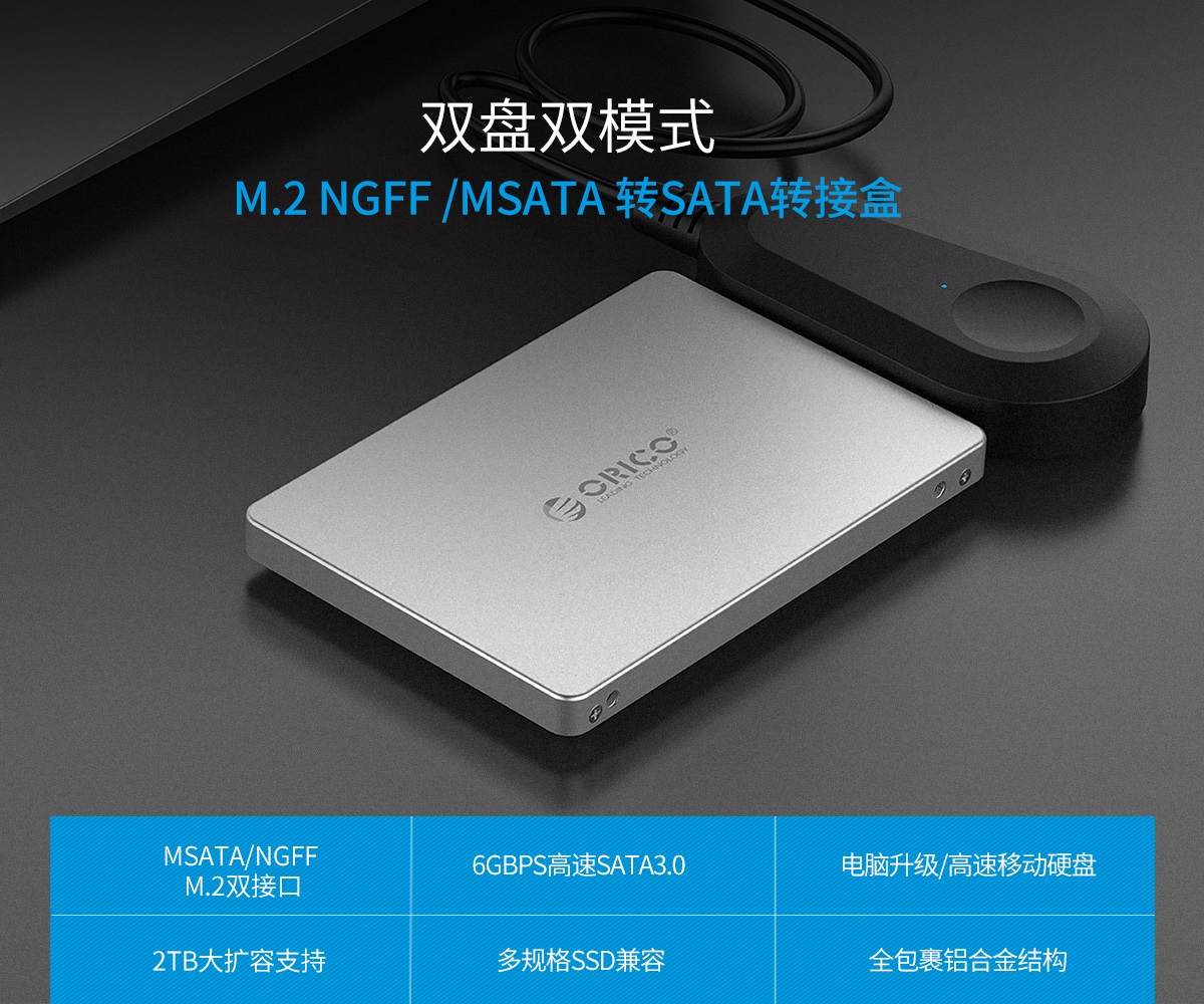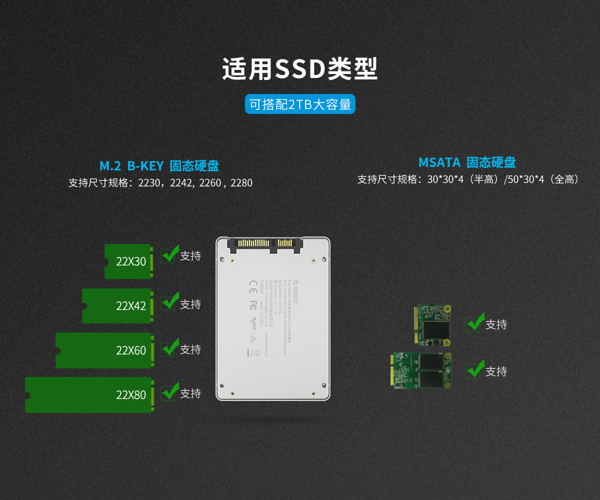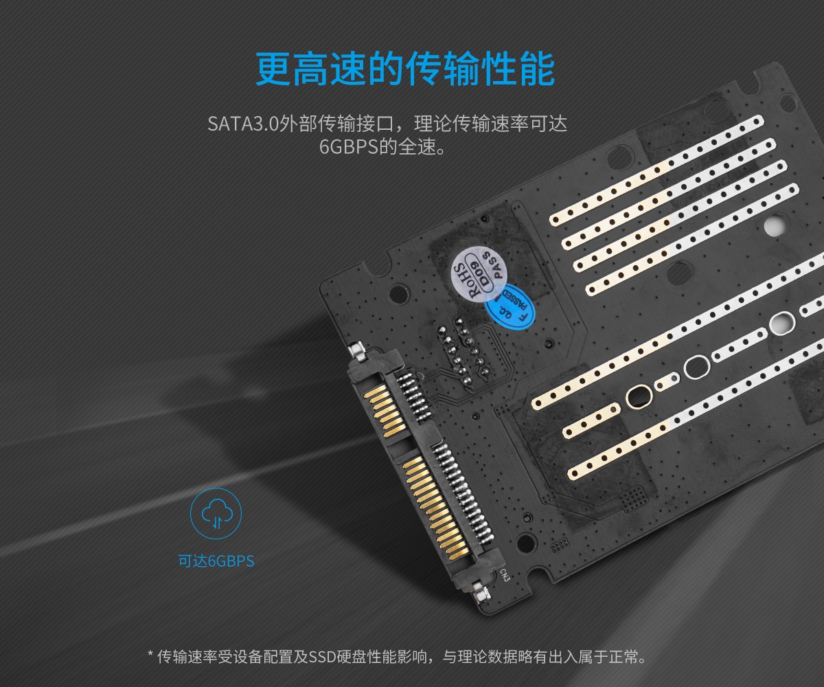 鋁合金材質,支持2230/2242/2260/2280四種M.2 SSD,6Gbps頂速傳輸,2TB大容量支持。