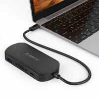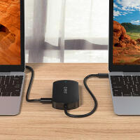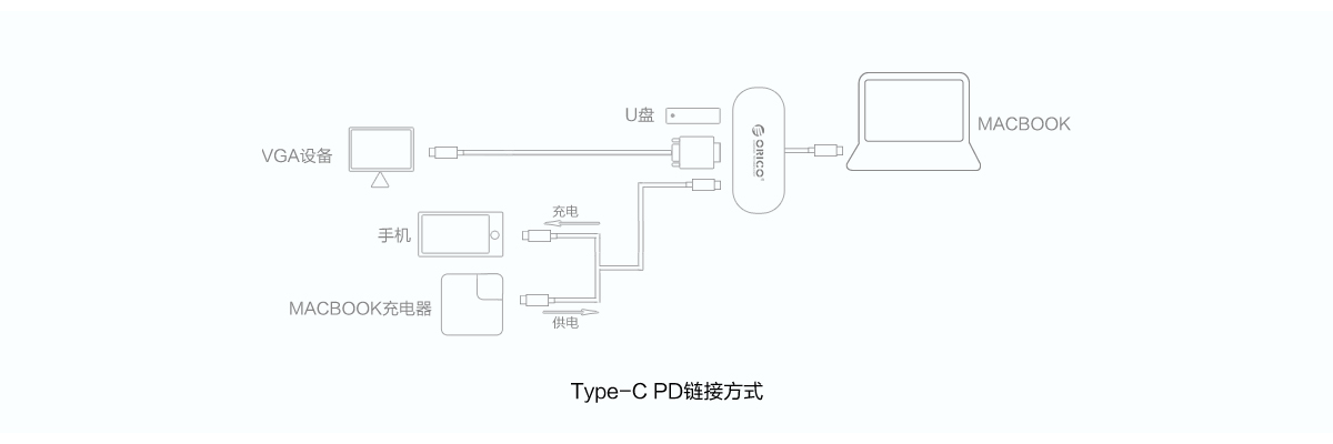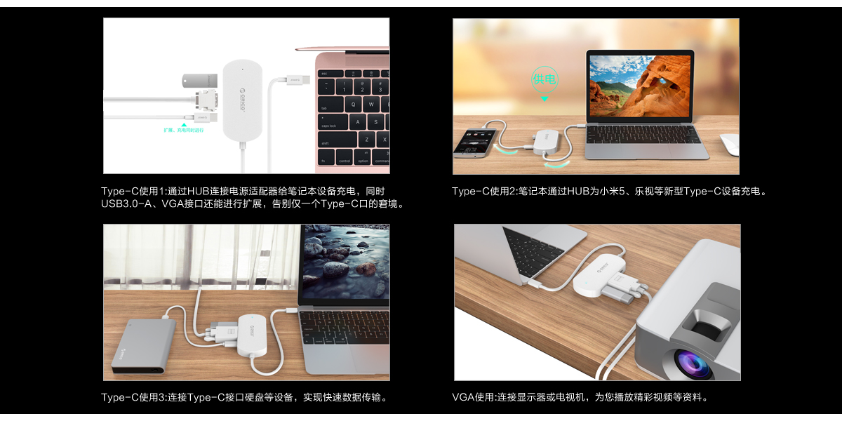 Type-C使用1,通過HUB連接電源適配器給筆記本設備充電,同時USB3.0-A、VGA接口還能進行擴展,告別筆記本只有一個Type-C接口的窘境;