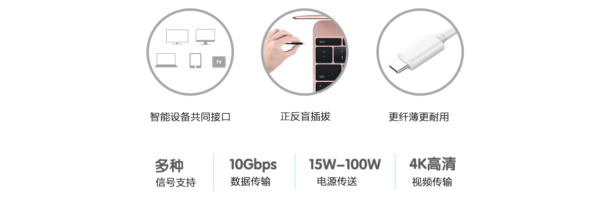 Type-C擁有正反盲插拔的易用性,且其更纖薄更耐用,同一條線纜可支持USB2.0、USB3.0、PCIe、DisplayPort和Thunderbolt等多種信號,同時擁有更高數據傳輸效率(10Gbps)、大功率電源傳送(15W-100W)、可實現4K高清視頻傳輸,將成為新生代設備的主流接口。