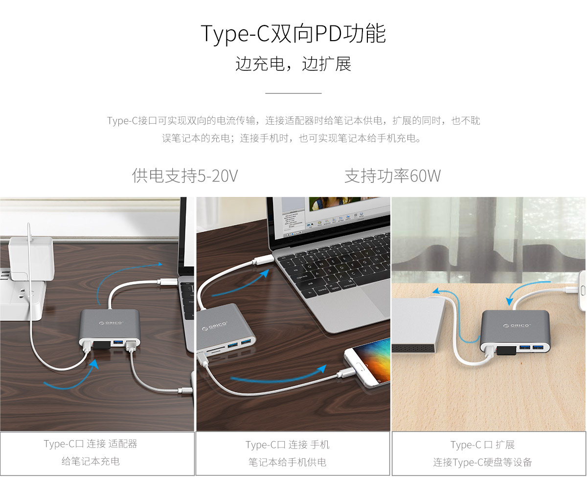TYPE-C接口支持雙向PD供電+數據傳輸功能,PD供電支持5-20V,60W Max