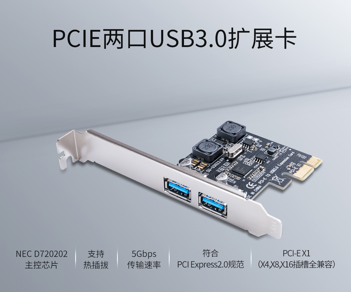 2口USB3.0 臺式機PCI-E擴展卡,PCI-E ×4/×8/×16全兼容