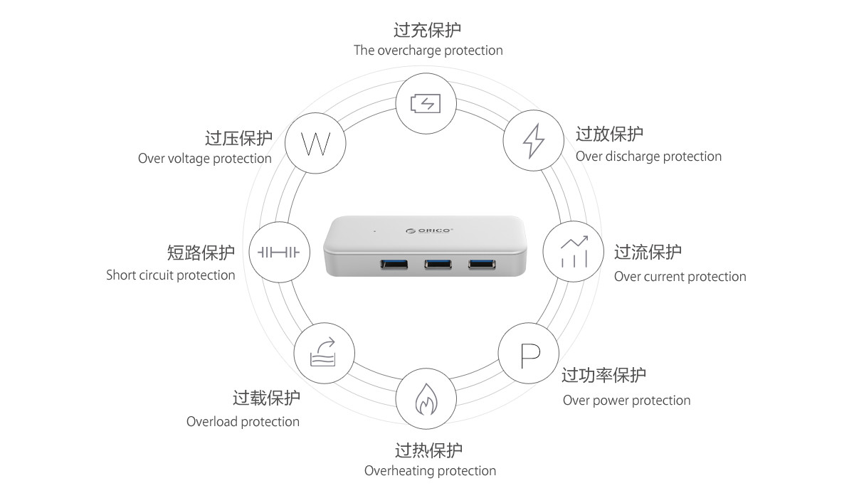支持過載電壓及瞬間電流保護功能,有效保護被連接的設備和HUB本身。
